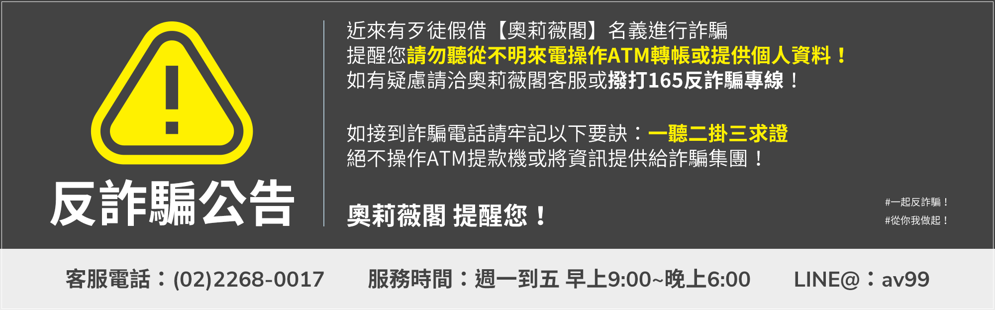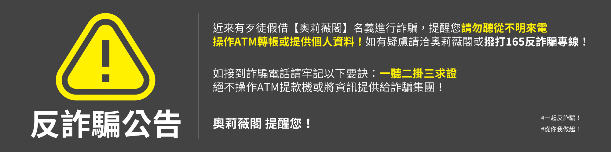 ✴奧莉薇閣不會在非上班時間主動以電話方式聯絡會員,若您接獲可疑電話,請於上班時間盡速來電與我們確認(02)2268-0017或撥打165反詐騙專線求證,以確保您的權益!切勿到ATM提款機做任何操作