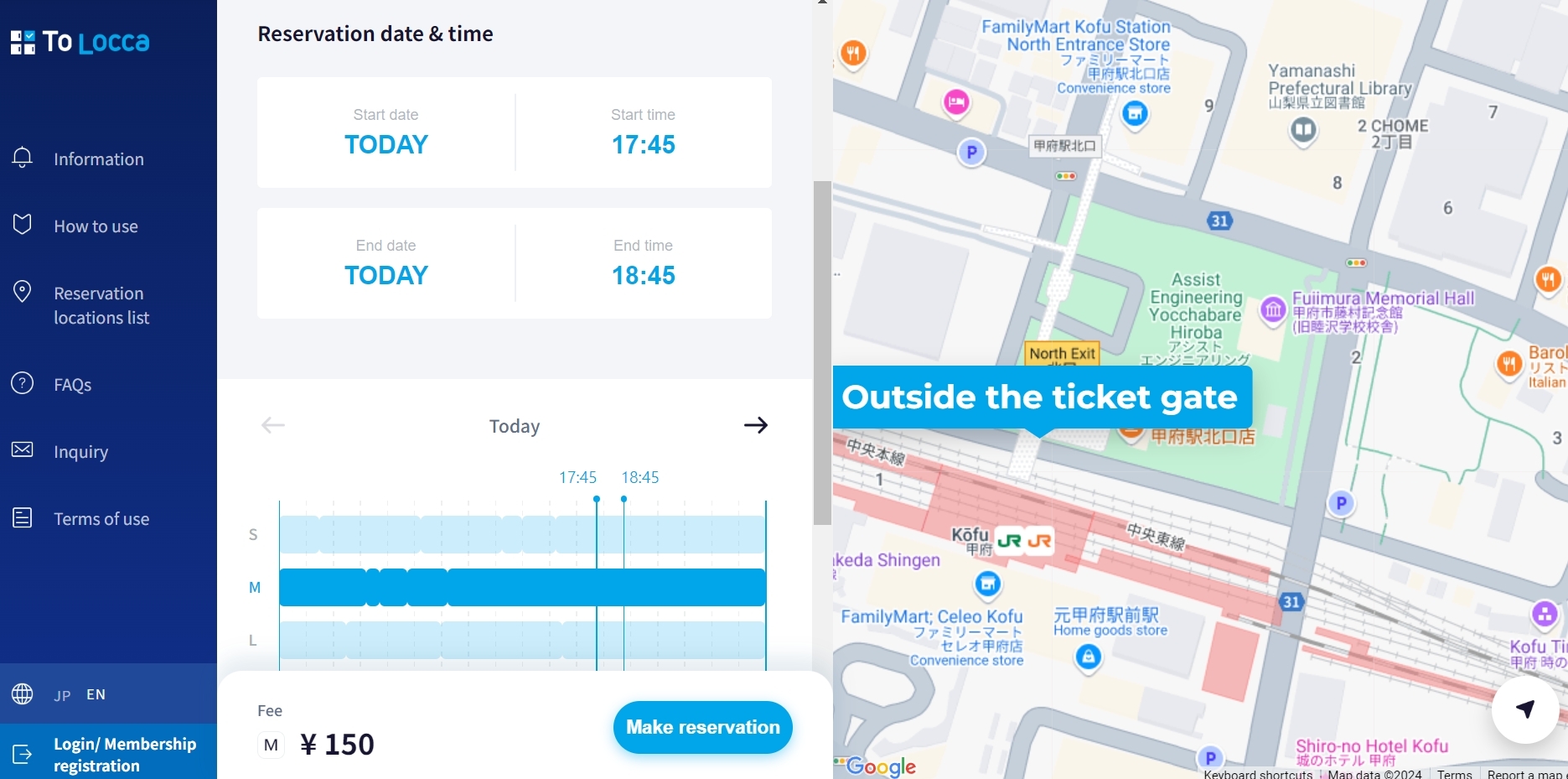 To Locca的介面可選用日文版本或是英文版本,提供關東地區的車站置物櫃預約服務,共有S、M、L 3種尺寸可供選擇,以小時為單位預約寄物,預約後系統會在預約時間15分鐘前發送附有預訂碼的電子郵件,到達置物處後只要輸入代碼即可開櫃使用。