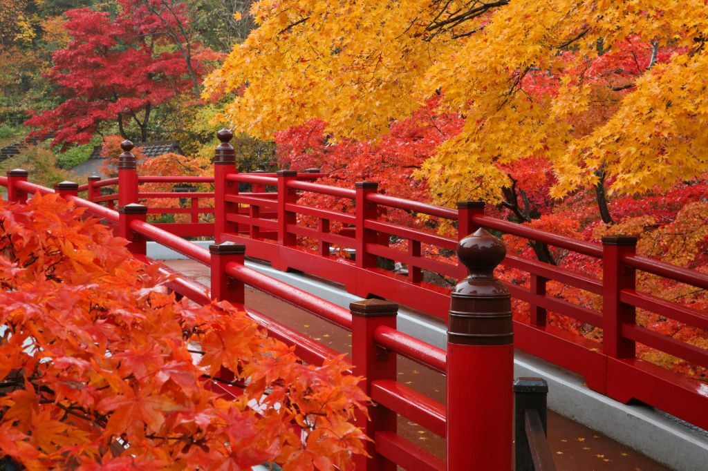 彌彥公園腹地4萬多坪,內有瀑布、隧道及溪流,生態相當豐富,其中賞楓最為著名的就是「紅葉谷」,搭配朱紅色觀月橋,與楓葉形成絕美夢幻景色,去到那裡別忘了散步到彌彥溫泉的發源地「湯之輪 (湯のわ)」免費體驗一下足湯的樂趣喔!