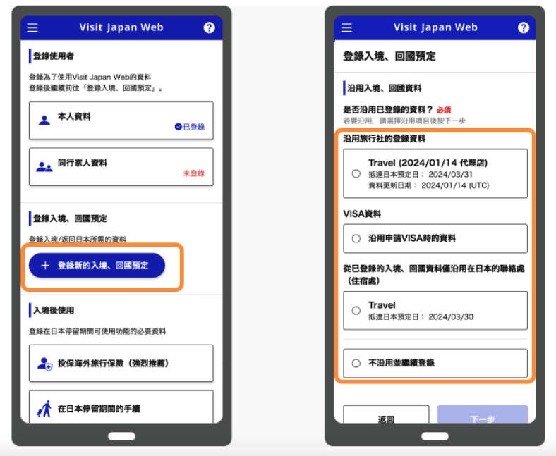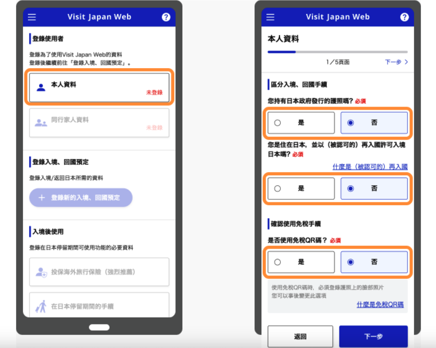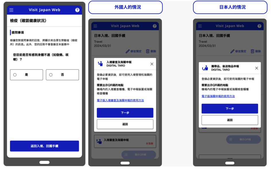 步驟四:輸入入境或返回日本的手續,包括檢疫、入境審查以及海關申報