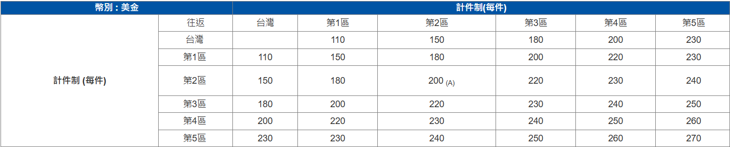 長程航線(往返美國各航點,關島除外)- USD 200/每件