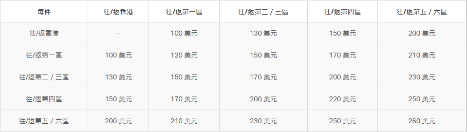 長程航線(往返美國各航點,關島除外)- USD 100/每件