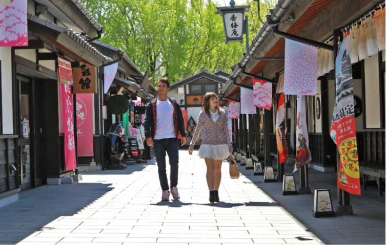 櫻花小路上聚集20多家特產商店,包含品嚐馬肉刺身、赤牛丼等熊本鄉土美食。馬肉有嚼勁脂肪量低,相傳是加藤清正出征時缺乏糧食而吃馬廄的馬,發現馬肉的鮮美而帶回日本的飲食新習慣。赤牛則是來自阿蘇山地帶,由於耐冷耐熱的特性採放牧。赤牛的肉質柔軟,全身大多以瘦肉為主,相較和牛的脂質較低卻又有和牛的香氣,因此赤牛有媲美和牛的稱號。